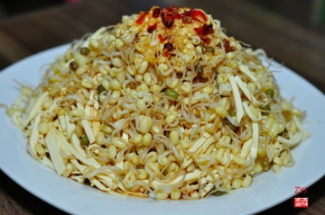 绿豆挑捡出杂质和不好的豆子,冲洗干净放入盆中,加清水浸泡一天待小芽发出把水倒掉,用一个相同大小的盆洗净,盆内加些水或是放点重物压在豆芽上面,放在避光,无油烟的地方,每天用清水冲洗豆芽2-3次,3天后即可食用,