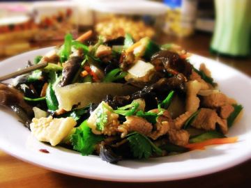 主料:番薯粉,五花肉(不带皮),水发木耳,黄瓜,香菇,香菜