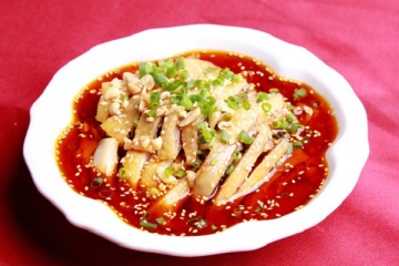 9、鸡肉切成大小合适的块,码放在碗里,淋上调好的辣椒红油,最后撒上葱花即可。