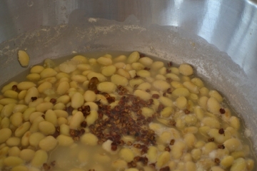 黄豆洗净投入锅内,加清水,水过豆面0.6厘米,加盐,盖锅置于旺火上煮15分钟,改用小火焖煮至豆皮皱起时离火,待温热时加入白糖、桔饼、甘草末,不断搅拌至卤汁干时即成。