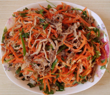 8、等百叶凉了,把胡萝卜倒入,加盐和香菜拌匀。根据个人口味,可以加醋和生的蒜蓉(喜欢酸辣口感的,我做的是不辣的口感)