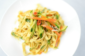 材料: 豆腐皮 200克 白葱(大葱)1根 青、红、黄椒丝 适量