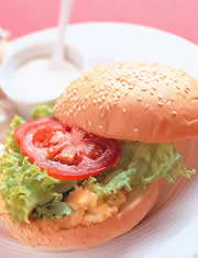2.将汉堡面包底层依序放上作法1的煎蛋、生菜、蕃茄片,挤上美乃滋,放上起司片,最后盖上上层汉堡面包即可。