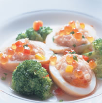 2.将馅料塞入作法1的蛋白,入锅以大火蒸约10分钟取出摆盘撒上鲑鱼卵,并以作法1的绿花椰菜做装饰。