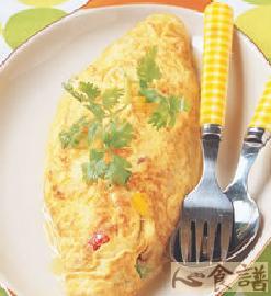 4.待锅中的蛋呈半熟状态时,将作法2的材料置于锅边,再从锅的另一边将蛋皮摺向有放材料的一端,整形成蛋包状即可盛盘。