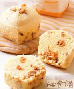 萝卜干150公克,虾仁75公克,全蛋240公克,二砂糖150公克,中筋面粉250公克,发粉3公克,盐2公克,奶水40公克,橄榄油20公克,装饰:适量