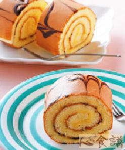 6.入炉烤焙,以上火190℃,下火150℃,烤约20分钟,出炉待凉后,底部抹上柳橙果酱捲起,每5公分切小段状即可。