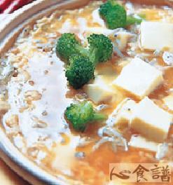 鸡蛋豆腐1块,吻仔鱼50公克,蛋2颗,酱汁:150㏄,柴鱼素1/3小匙,酱油1/2大匙,酒1大匙,糖1/2大匙,盐1/4小匙