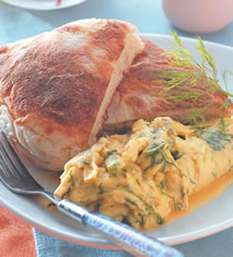 4.取平底锅,加入奶油烧热,倒入作法2的蛋液,煎至半熟液态状,以筷子快速搅拌后即可起锅盛盘,再于盘内放上作法1的大饼即可。
