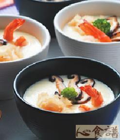 3.将全蛋加入调味料a打散后加入作法1的干贝丝、香菇、作法2的虾仁与清高汤,一起用小火蒸约10∼12分钟至熟即完成。