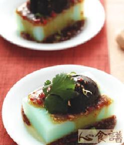 2.凉粉块切半盛盘,放上作法1切对半的皮蛋。