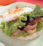 3.米饼中依序夹入生菜、作法1的凉拌蒟蒻、美乃滋,撒上熟白芝麻,放上海苔即可。