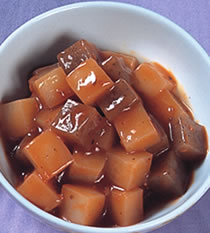 1.将板状白蒟蒻和黑蒟蒻切成约1.5公分大小的块状后,再用热水汆烫3分钟取出沥干水份备用。