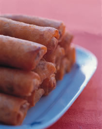 (3)把1张春卷皮铺平,盛1又1/2大匙的馅料,排入春卷皮内,成长条状,再将包好的春卷捲起,最前端可以涂上面粉煳,帮助黏紧,固定好即完成,依序作好备用。