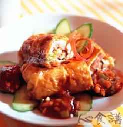 6.将作法5的腐皮卷以160℃的热油炸至表皮酥脆,盛盘时淋上淋酱汁即可。