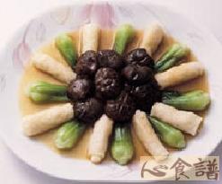 (5)将竹笙、冬菇及青江菜排盘,热锅入高汤,下太白粉芶芡淋在上面即可。