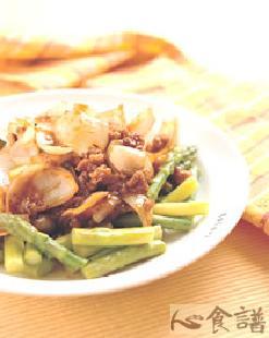 4.)将炒熟的百合绞肉盛装在芦笋上即可。