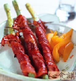 粗芦笋6根,培根肉片6片,辣味烤肉酱少许