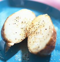 2.烤箱预热至250℃,将作法1放入烤箱烤约15分钟后取出,打开锡箔纸,用刀将马铃薯对切成两半,涂上奶油,撒上大蒜盐、黑胡椒粉,再烤2分钟即可。