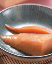 绿竹笋300g,洗米水少许,干辣椒2根,煮汁:30㏄,水300㏄,柴鱼素1小匙,酒15㏄,糖13g,味醂40㏄
