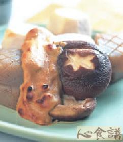 4.将芋头、蒟蒻、香菇摆入盘中,淋上作法3的味噌酱适量,放入烤箱以200℃烤至食材表面上色即可。