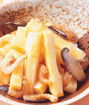 2.热锅,放入少许油,以小火爆香虾米及香菇丝后,放入桂竹笋及调味料a,以中火炒约1分钟至汤汁收干,淋入辣油及香油拌匀即可。