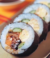2.于海苔片上舖上寿司饭(海苔片前端预留1公分),并依序放入香菇丝、小黄瓜、红萝卜煮、干瓢煮、厚蛋烧和鳗鱼后捲起即可。