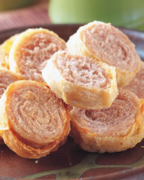 3.将裁好的腐皮尖端朝上,取适量的作法2馅料放置于腐皮上再往外捲起(大小约为手指粗细),再沾少许作法1的面煳,涂抹于腐皮尖端边缘处,以作为固定。