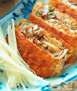 2.将腐衣张开,平铺在桌上,于其中放入作法1的材料,包捲起成15公分x6公分x1公分的长方形状备用。