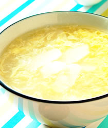 8.将作法6熄火,趁热淋入作法7的蛋汁,以同一方向慢速搅拌出蛋花即可。