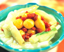 2.热锅,加入高汤煮至滚沸后,加入作法1的大白菜心、白果及盐以大火煮滚后,转小火续煮至大白菜心熟透时,撒下适量枸杞略微拌炒,起锅前滴入香油即可。