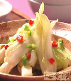 主料:大白菜300克。精盐,白糖,白醋,干辣椒,生姜,花椒,花生油。