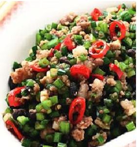 韭菜80公克,猪绞肉50公克,豆豉10公克,大蒜3粒,红辣椒1支,酱油1大匙,鲜鸡粉1/2小匙,米酒1大匙