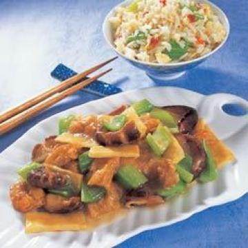 5.炒后即下面筋和各种调味,烧到卤汁稠浓即勾芡,淋熟花生油,起锅装盘即成。