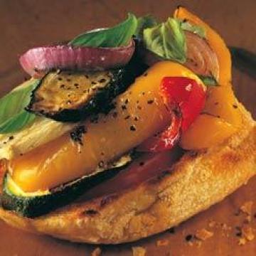 4.面包烘好后,用蒜瓣和番茄擦抹,在上面堆放炙烤好的菜蔬,浇上剩余的橄榄油,撒上盐和黑胡椒调味。最后,将罗勒叶洗净沥干,撕成小片撒在上面,趁热食用。
