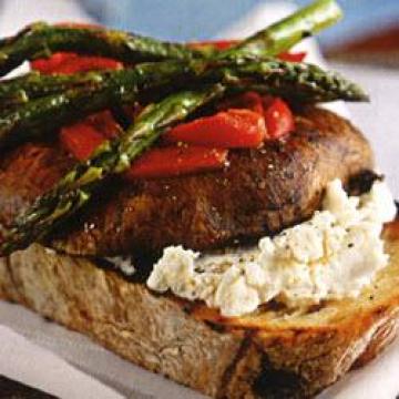 3.关闭炭烤炉或上火烧烤器的电源。面包放在烤栅上,加温2分钟。羊奶奶酪涂在面包上,依序放上蘑菇、甜椒和芦笋,趁热享用。