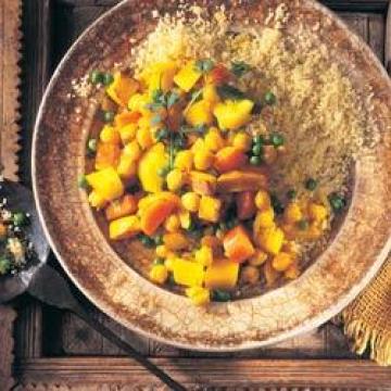 橄榄油1汤匙,洋葱1个,切成丁,蔬菜汁750毫升,胡萝卜2根,去皮,切丝,萝卜2根,去皮,切丝,红薯1个,切丝,小胡瓜(黄瓜)1个,切丝,红椒1个,切丝,罐装鹰嘴豆400克,沥干,番茄辣酱400克,肉桂粉1/4茶匙,姜黄粉1/2茶匙,藏红花粉1小搓,咖喱粉1小搓,粗麦粉350克