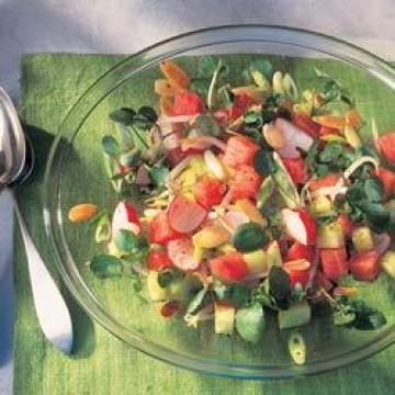 5.西洋菜摘去枯叶,洗净沥干,放在浅盘里。将西瓜或白兰瓜、胡瓜加到沙拉盆中,轻轻搅拌。用匙子舀出拌好的瓜菜放在西洋菜上。上桌前撒上杏仁。