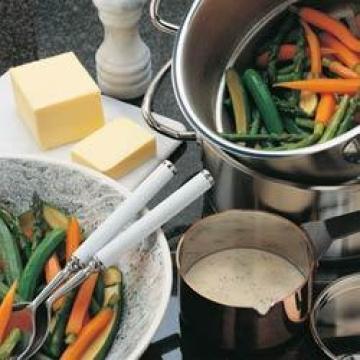 5.预热菜盘,放入蒸熟的蔬菜,放入黄油、黑胡椒,拌匀。浇上酸奶油,轻轻拌匀,立即上桌。