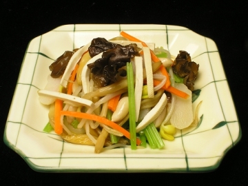 1、木耳、香菇、金针菜分别用温水泡发,与百叶、胡萝卜、黄瓜、冬笋一起洗净。