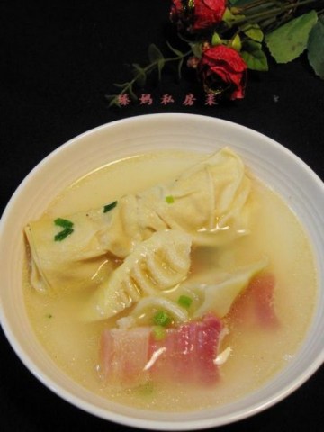 4.沙锅里放入高汤(没有高汤清水也可以),放几片生姜和几段葱及咸肉片,大火烧开一会,依次丢入百叶包及春笋,继续中小火煲10分钟左右,出锅前撒上香葱花及少许白胡椒粉和鸡精,淋上香油即可(尝尝咸淡,一般情况下是不需要再放盐的,咸肉里有盐分)