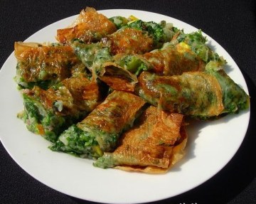 3、平底锅烧热,略放油,入菜卷,中小火煎至金黄,切段即可。