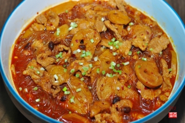 素肠(面筋),里脊肉,牛心菜,粉丝,辣椒油,豆豉辣椒酱,葱,姜,蒜,料酒,淀粉,盐