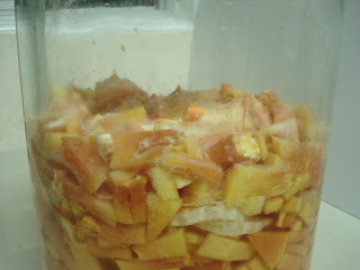 1. 把半生熟木瓜, 柠檬和糖分成三分