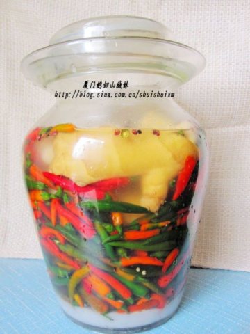 2、用家里的泡菜水,或超市的小米泡椒,加姜片、盐、白醋,花椒,制作