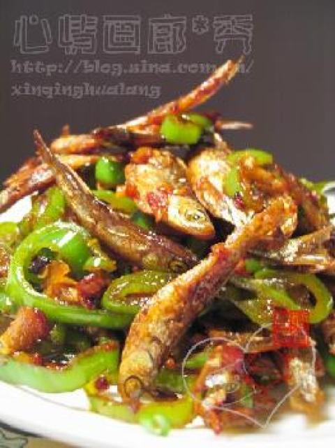 淡干鱼据说就是河里的小游鱼直接摆板子上吹干的,没有盐味的。 我怕青椒不辣又加了辣椒粉~hoho……超级下饭~