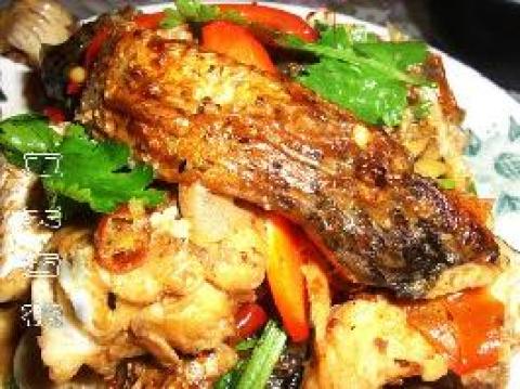 4.锅中热油,爆香姜片和辣椒,倒入炸好的鱼块
