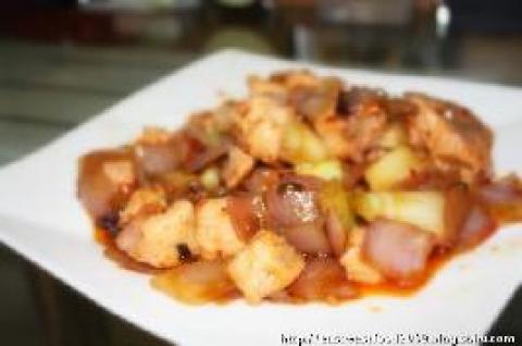 紫色洋葱,姜片,挪威三文鱼,葱段,泡椒,糖,酱油,辣椒汁