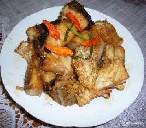 3.锅烧热后放入油,尽量多些,待油7分热后将洗净的鱼肉下锅。注意:要一块块用筷子夹进锅里,两块最好不相连。小火慢慢煎,待鱼肉蛋黄色后翻边继续煎。鱼肉全部蛋黄色后,将剩余的油倒出,撒上辣椒末、大蒜末、生姜条。放上少许料酒和醋,加两滴酱油。淬少许水,快速搅动,根据咸淡情况加少许盐。