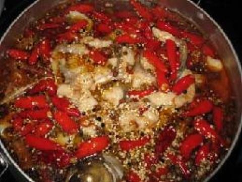 5.再起油锅,下麻椒,辣椒.(注意火候,否则辣椒就会变黑的)淋到鱼片上就可以啦。